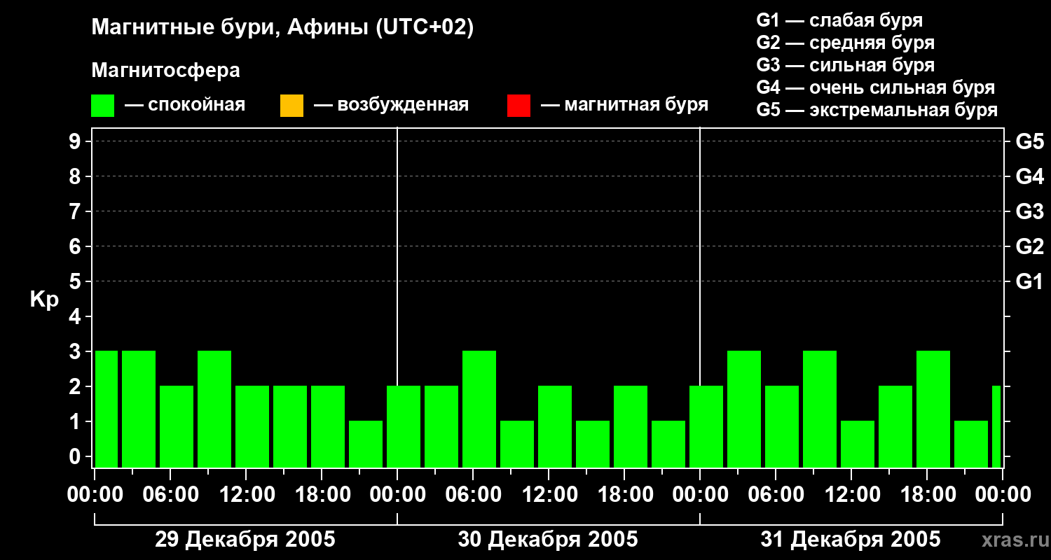 Изменения геомагнитного индекса Kp с 29 по 31 декабря 2005 года для средних широт