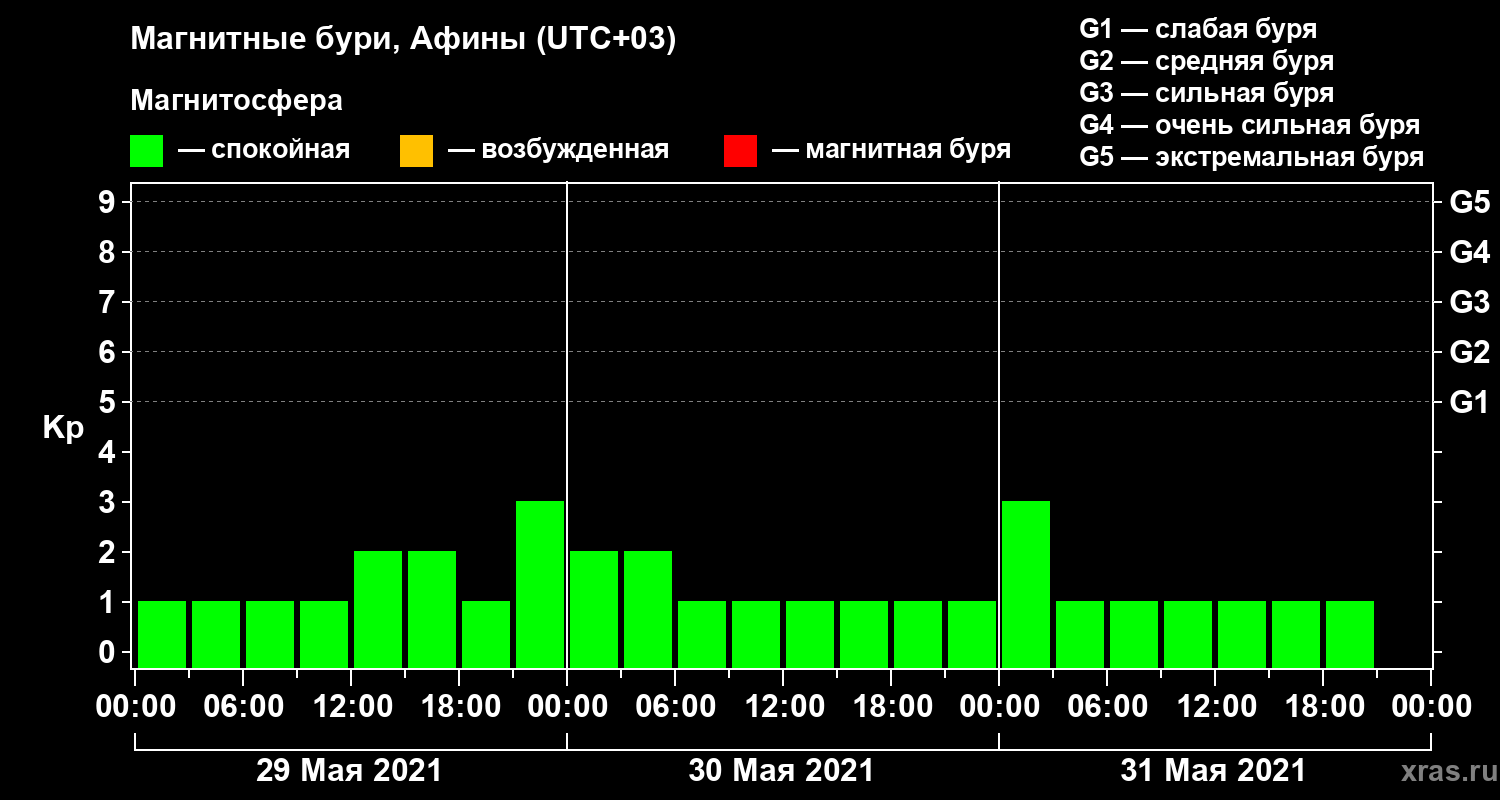 Изменения геомагнитного индекса Kp с 29 по 31 мая 2021 года для средних широт