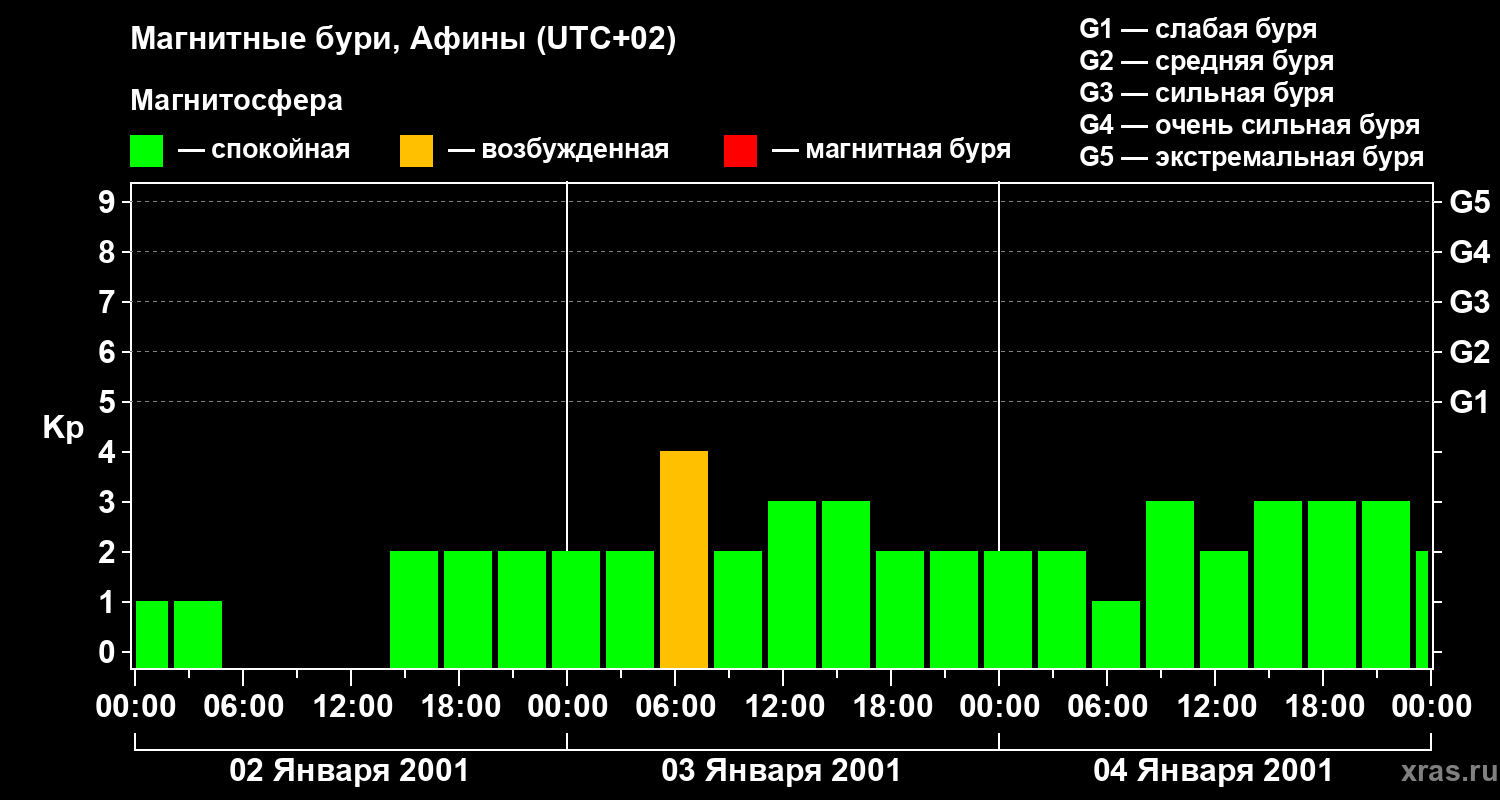 Изменения геомагнитного индекса Kp с 2 по 4 января 2001 года для средних широт