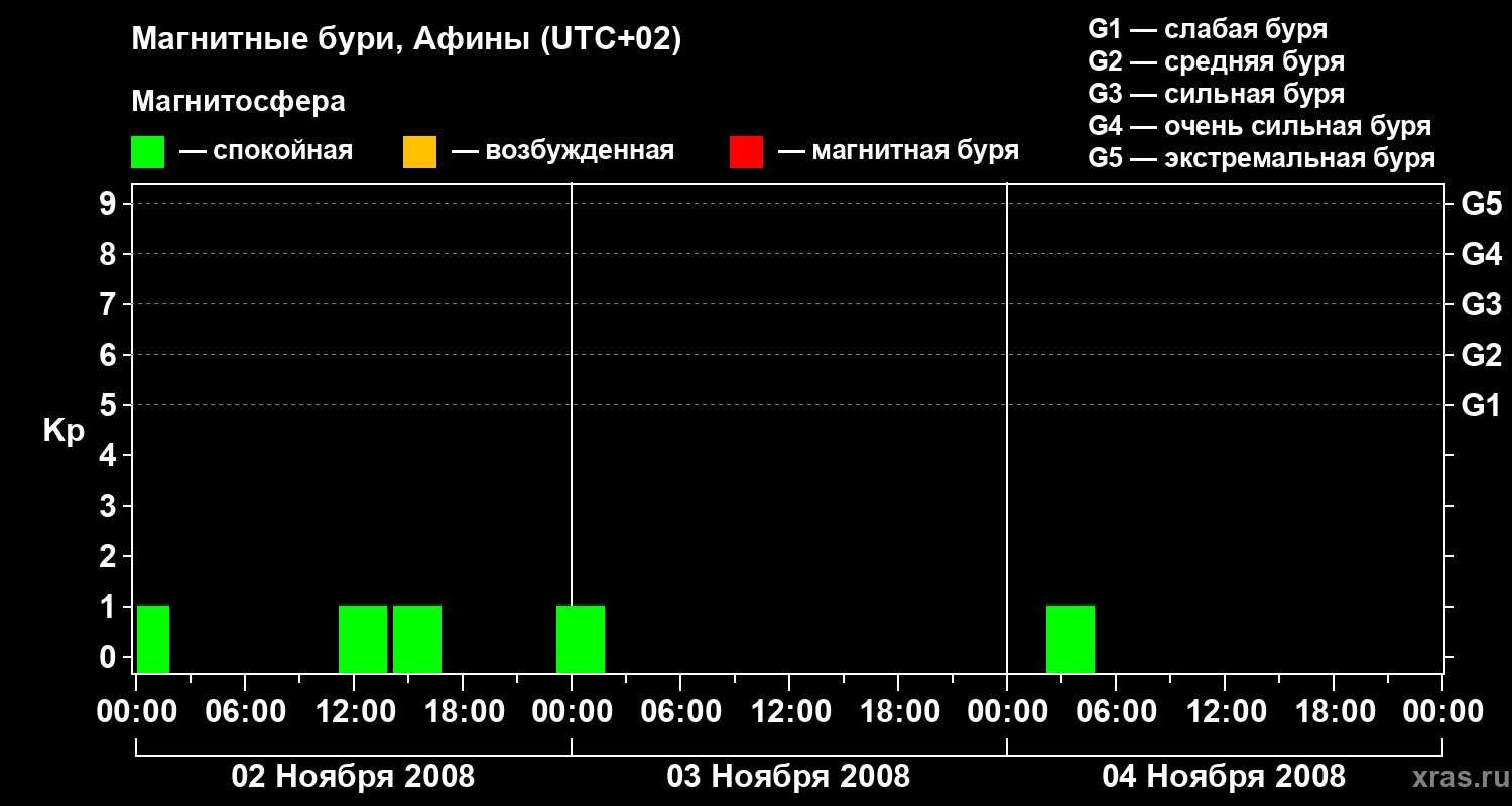 Изменения геомагнитного индекса Kp с 2 по 4 ноября 2008 года для средних широт
