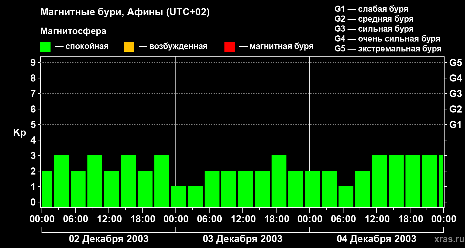 Изменения геомагнитного индекса Kp с 2 по 4 декабря 2003 года для средних широт