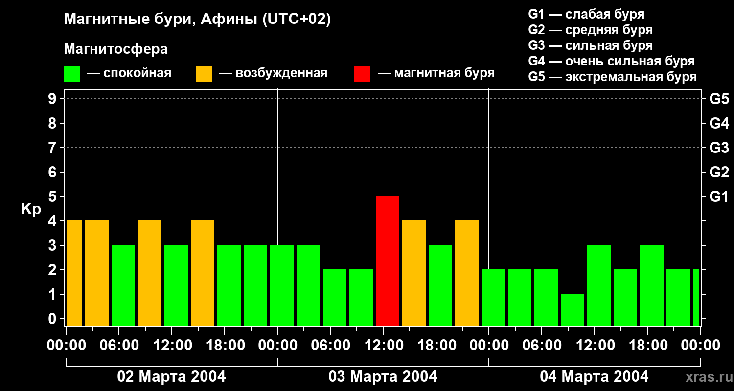 Изменения геомагнитного индекса Kp с 2 по 4 марта 2004 года для средних широт