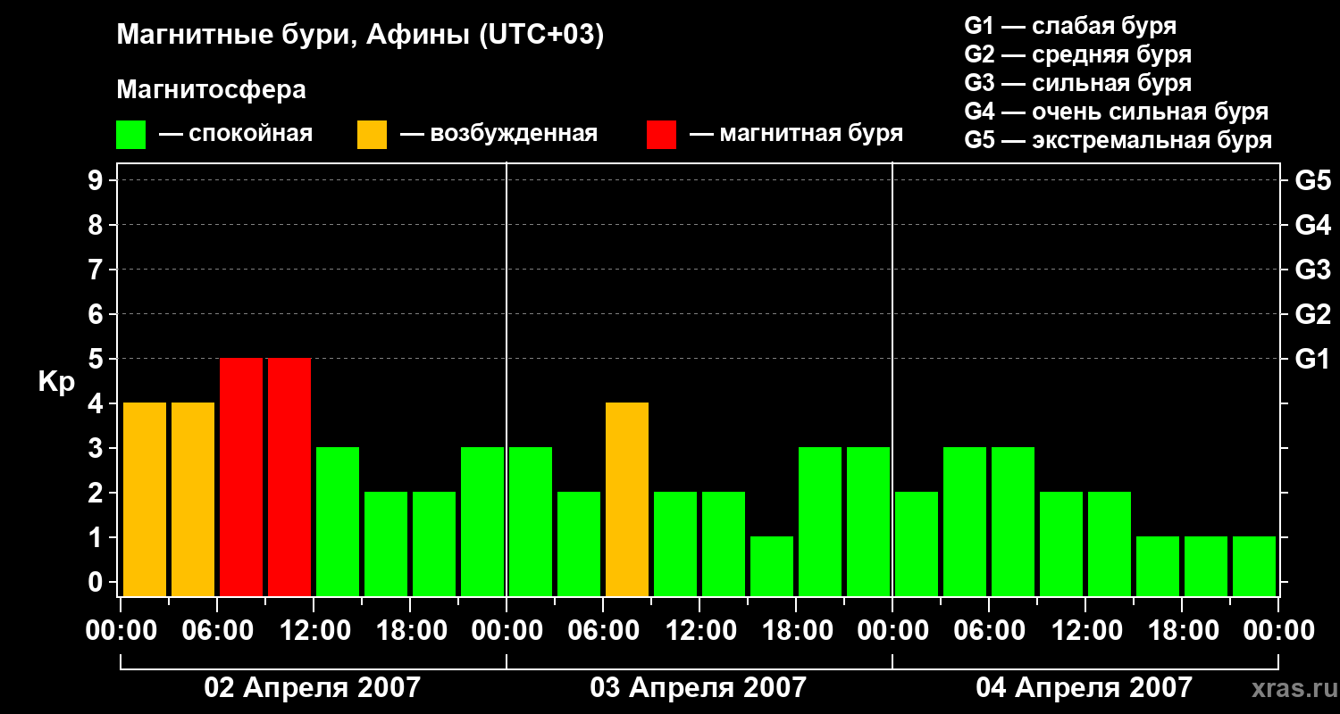 Изменения геомагнитного индекса Kp с 2 по 4 апреля 2007 года для средних широт