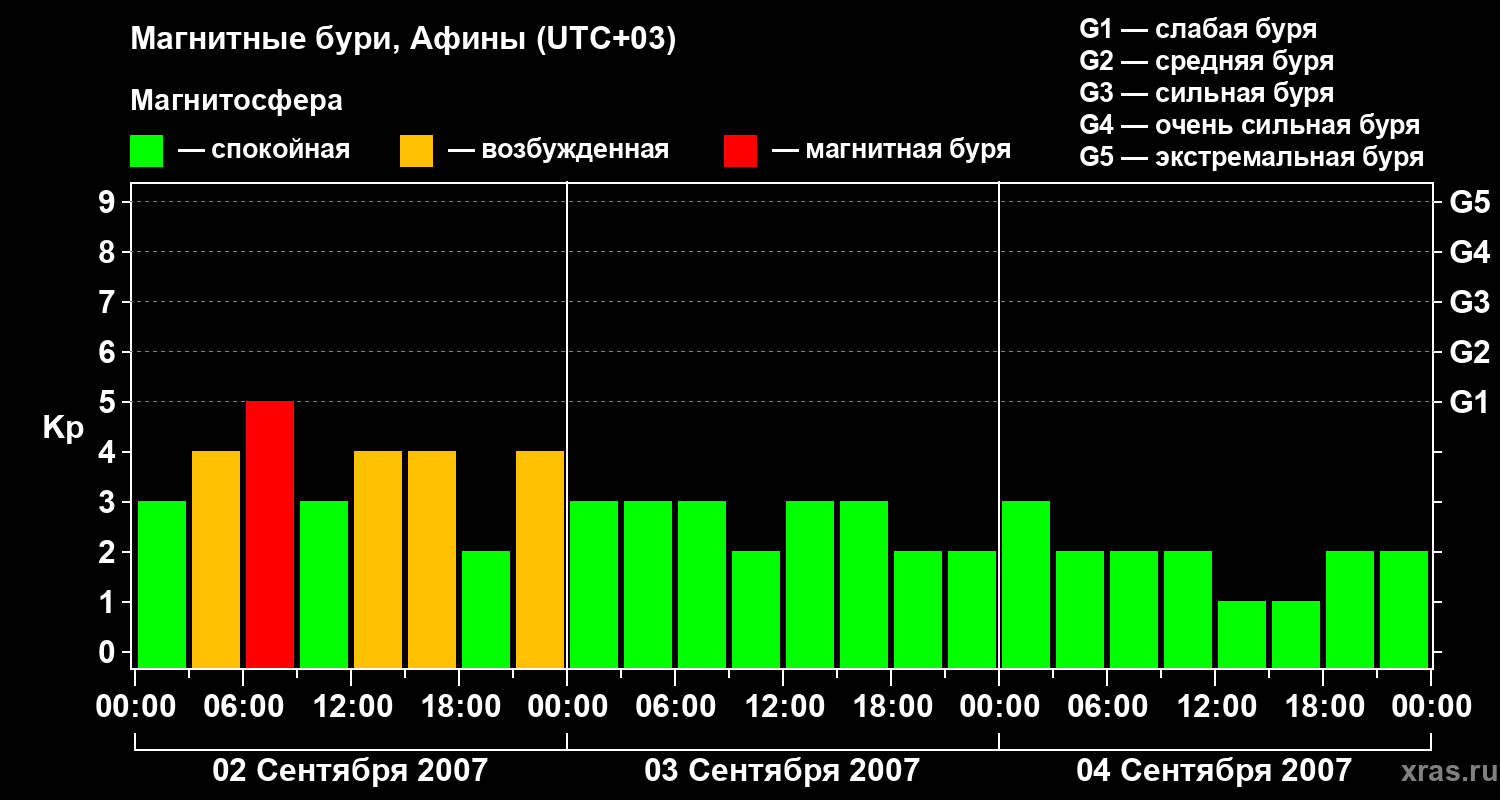 Изменения геомагнитного индекса Kp с 2 по 4 сентября 2007 года для средних широт