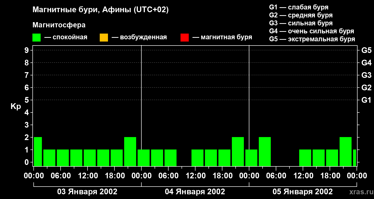 Изменения геомагнитного индекса Kp с 3 по 5 января 2002 года для средних широт