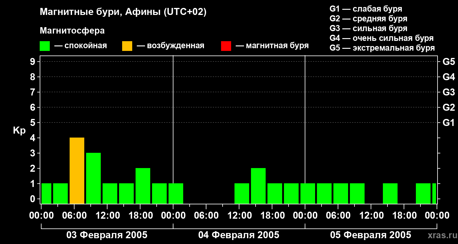 Изменения геомагнитного индекса Kp с 3 по 5 февраля 2005 года для средних широт