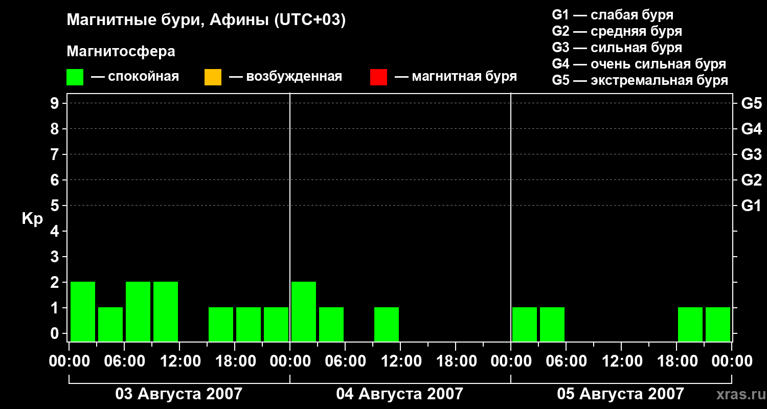 Изменения геомагнитного индекса Kp с 3 по 5 августа 2007 года для средних широт