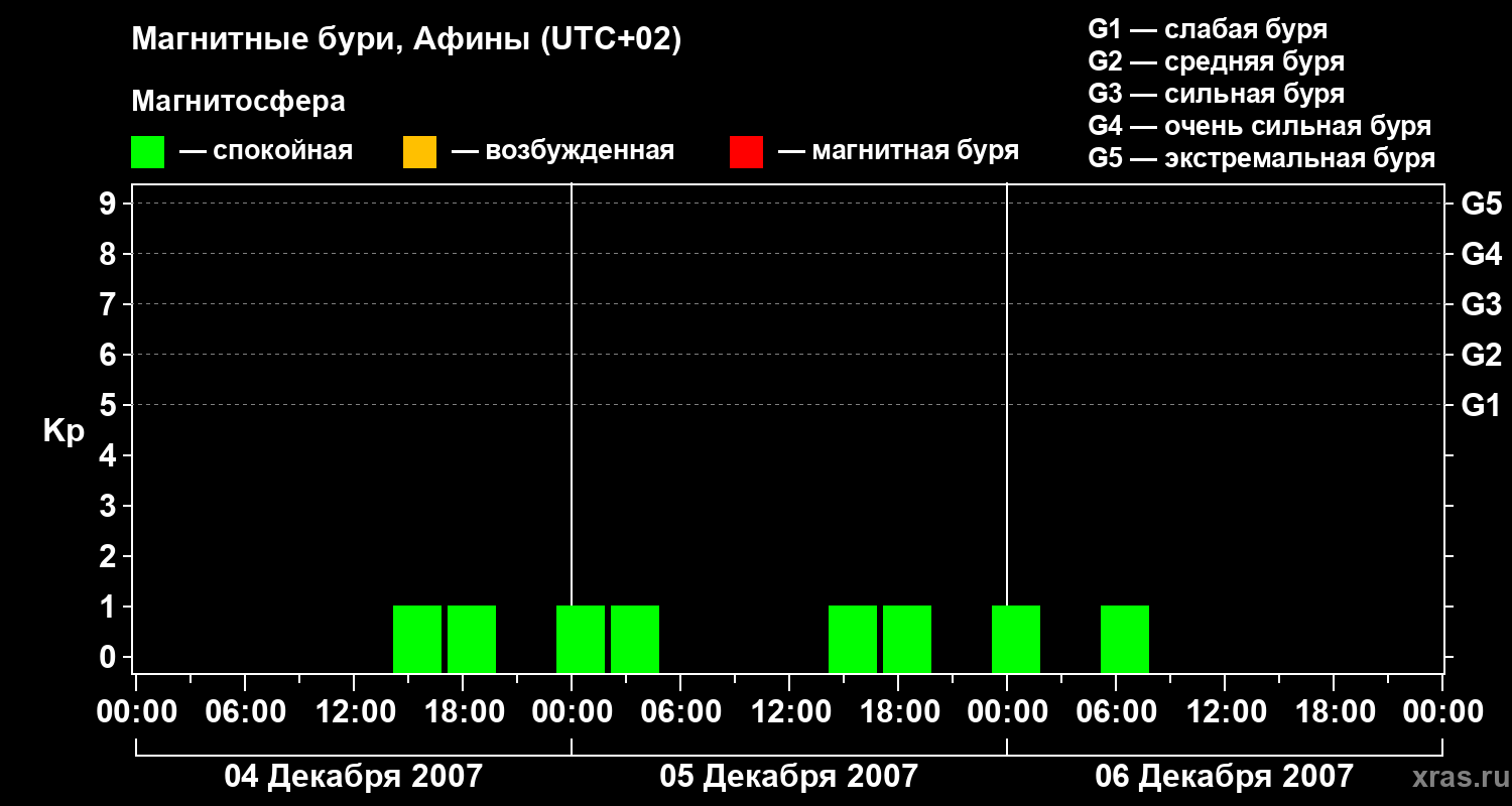 Изменения геомагнитного индекса Kp с 4 по 6 декабря 2007 года для средних широт