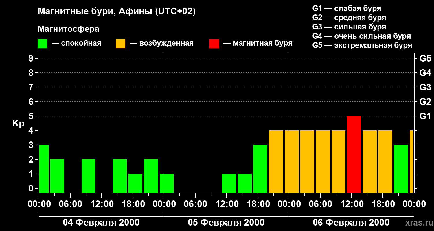 Изменения геомагнитного индекса Kp с 4 по 6 февраля 2000 года для средних широт