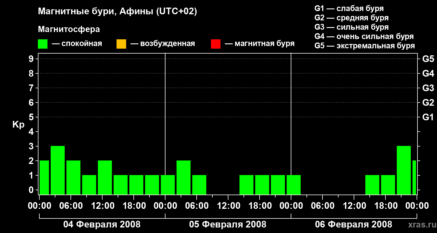 Изменения геомагнитного индекса Kp с 4 по 6 февраля 2008 года для средних широт