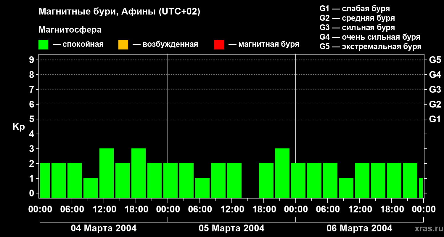 Изменения геомагнитного индекса Kp с 4 по 6 марта 2004 года для средних широт