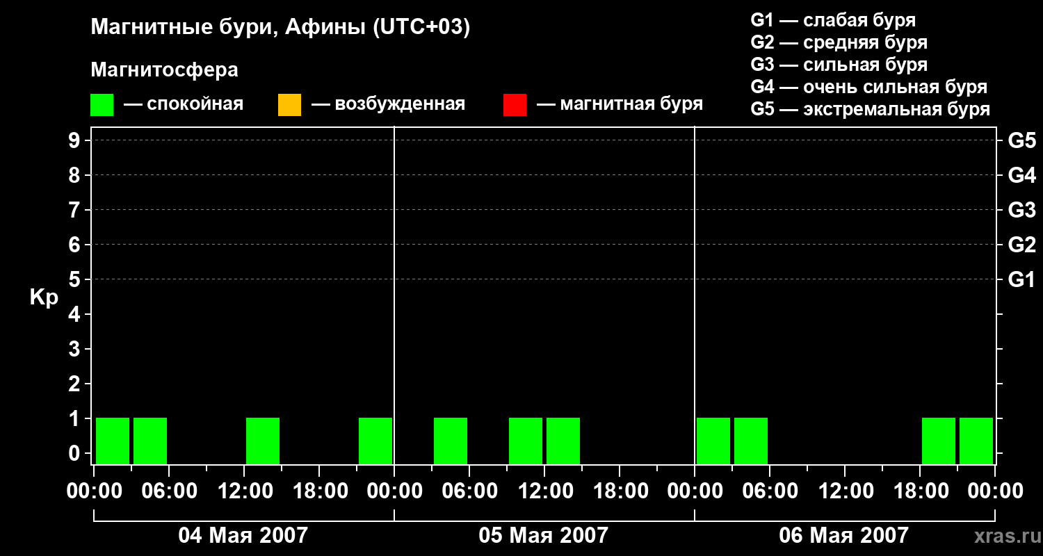 Изменения геомагнитного индекса Kp с 4 по 6 мая 2007 года для средних широт