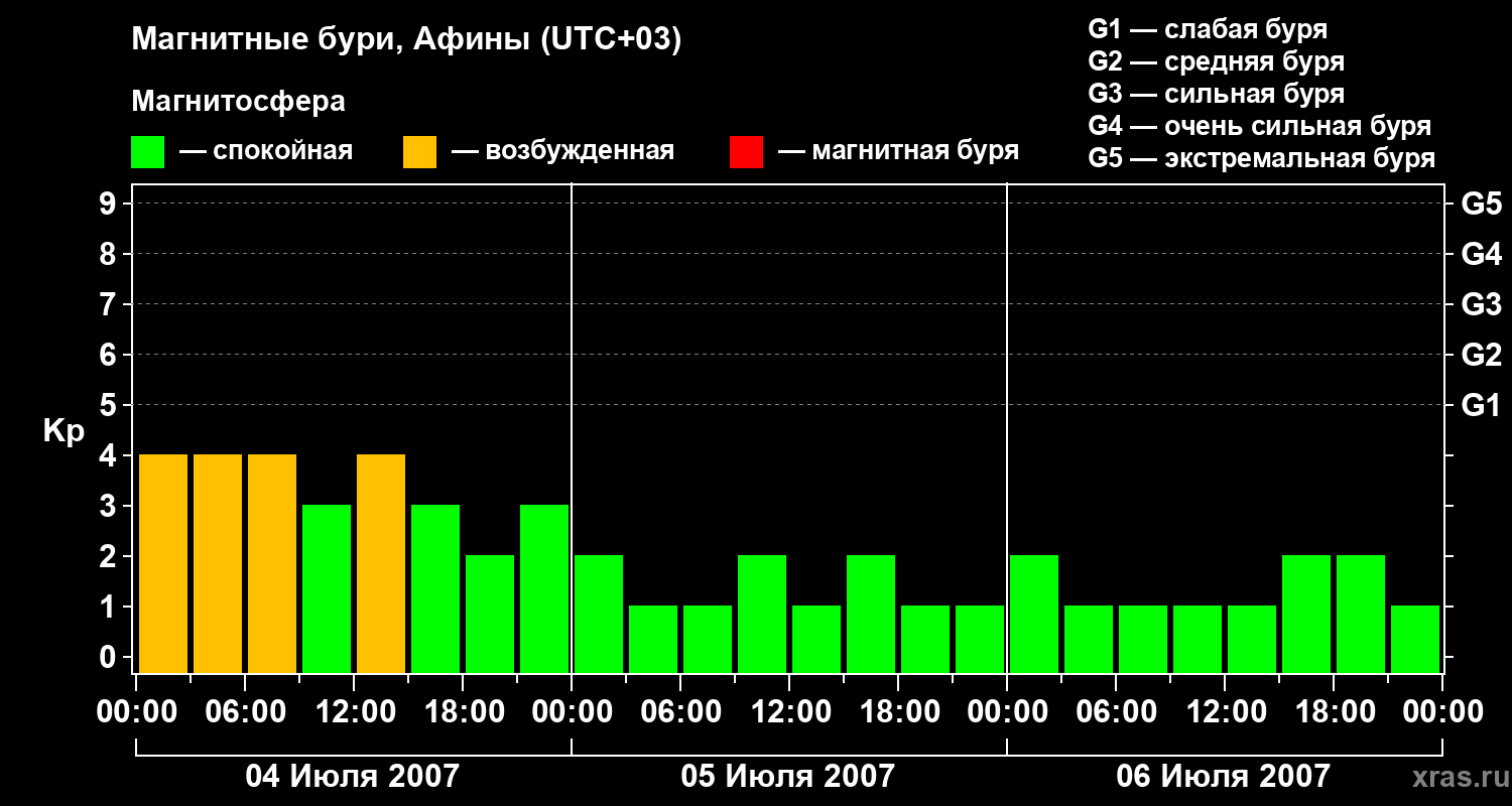 Изменения геомагнитного индекса Kp с 4 по 6 июля 2007 года для средних широт
