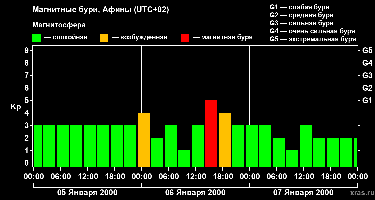 Изменения геомагнитного индекса Kp с 5 по 7 января 2000 года для средних широт