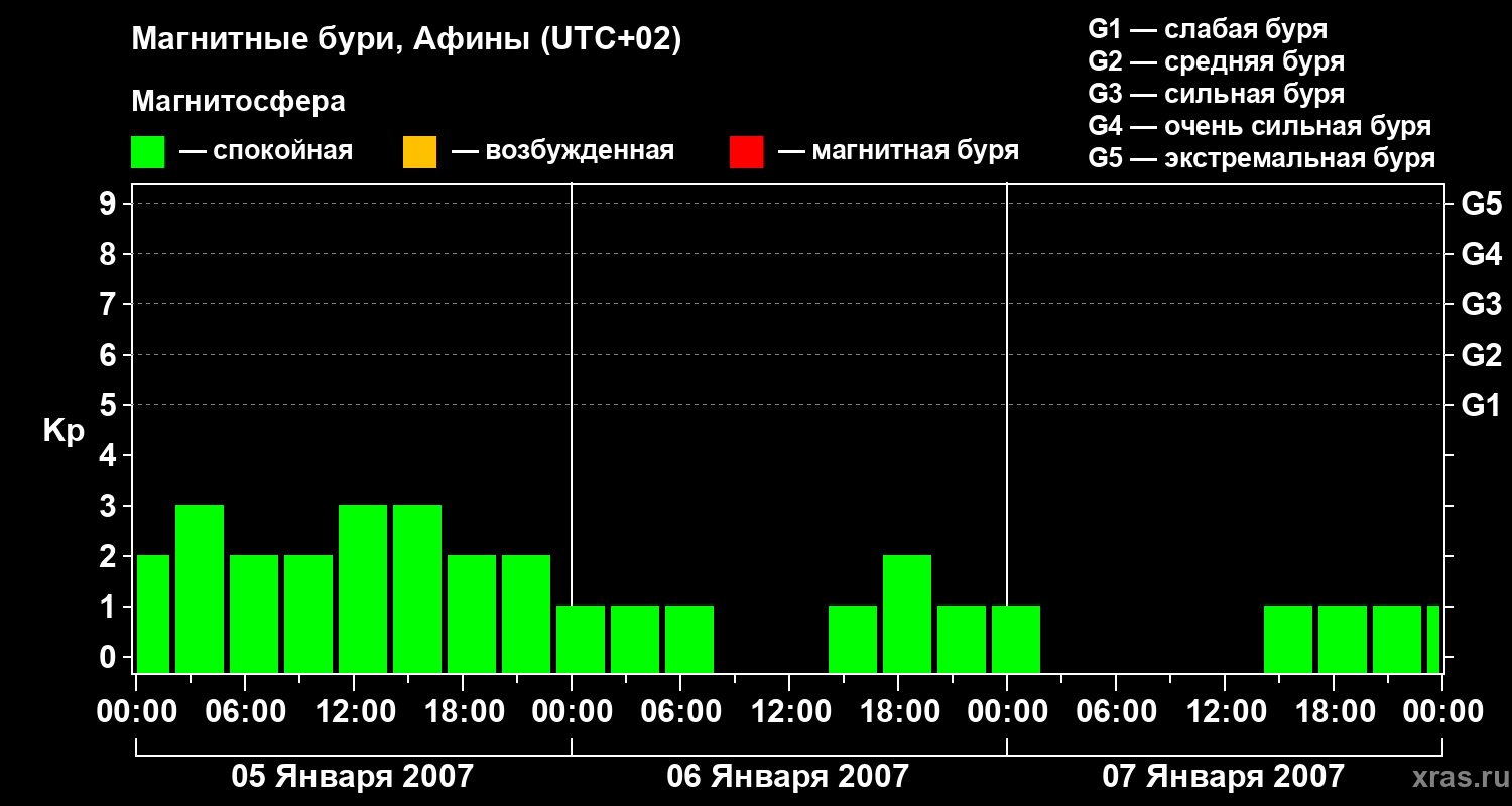 Изменения геомагнитного индекса Kp с 5 по 7 января 2007 года для средних широт