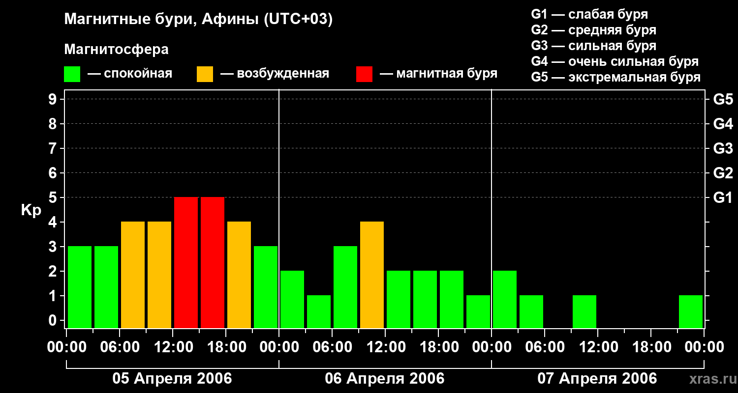 Изменения геомагнитного индекса Kp с 5 по 7 апреля 2006 года для средних широт