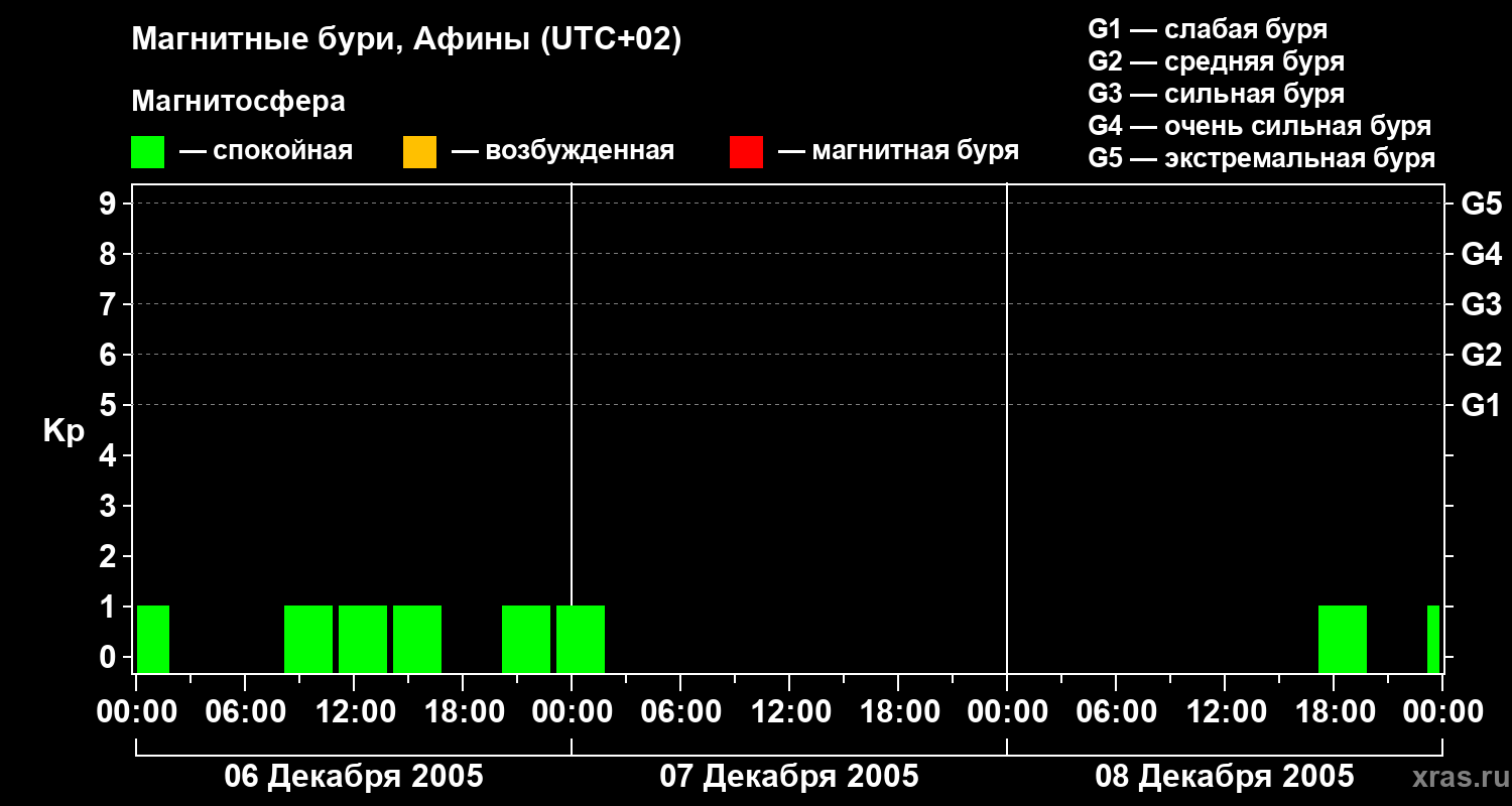 Изменения геомагнитного индекса Kp с 6 по 8 декабря 2005 года для средних широт