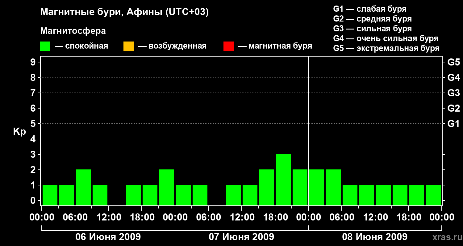 Изменения геомагнитного индекса Kp с 6 по 8 июня 2009 года для средних широт