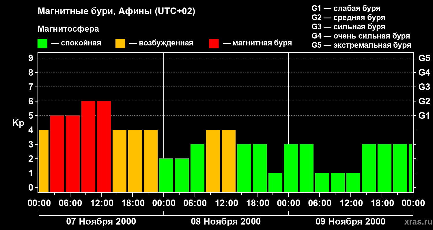 Изменения геомагнитного индекса Kp с 7 по 9 ноября 2000 года для средних широт