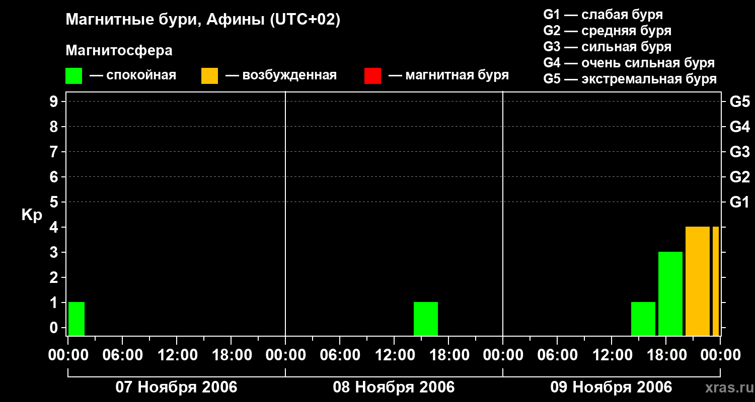 Изменения геомагнитного индекса Kp с 7 по 9 ноября 2006 года для средних широт