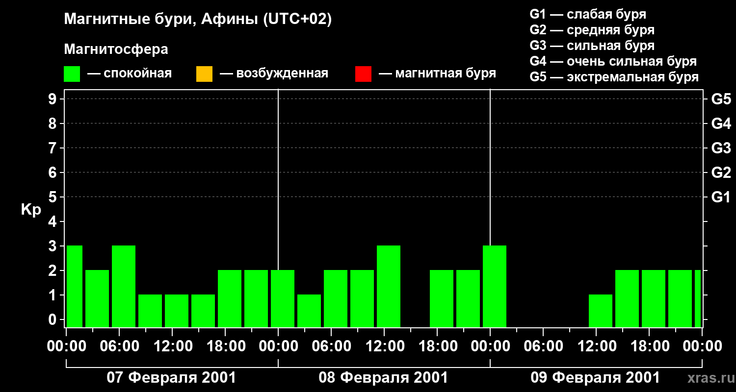 Изменения геомагнитного индекса Kp с 7 по 9 февраля 2001 года для средних широт