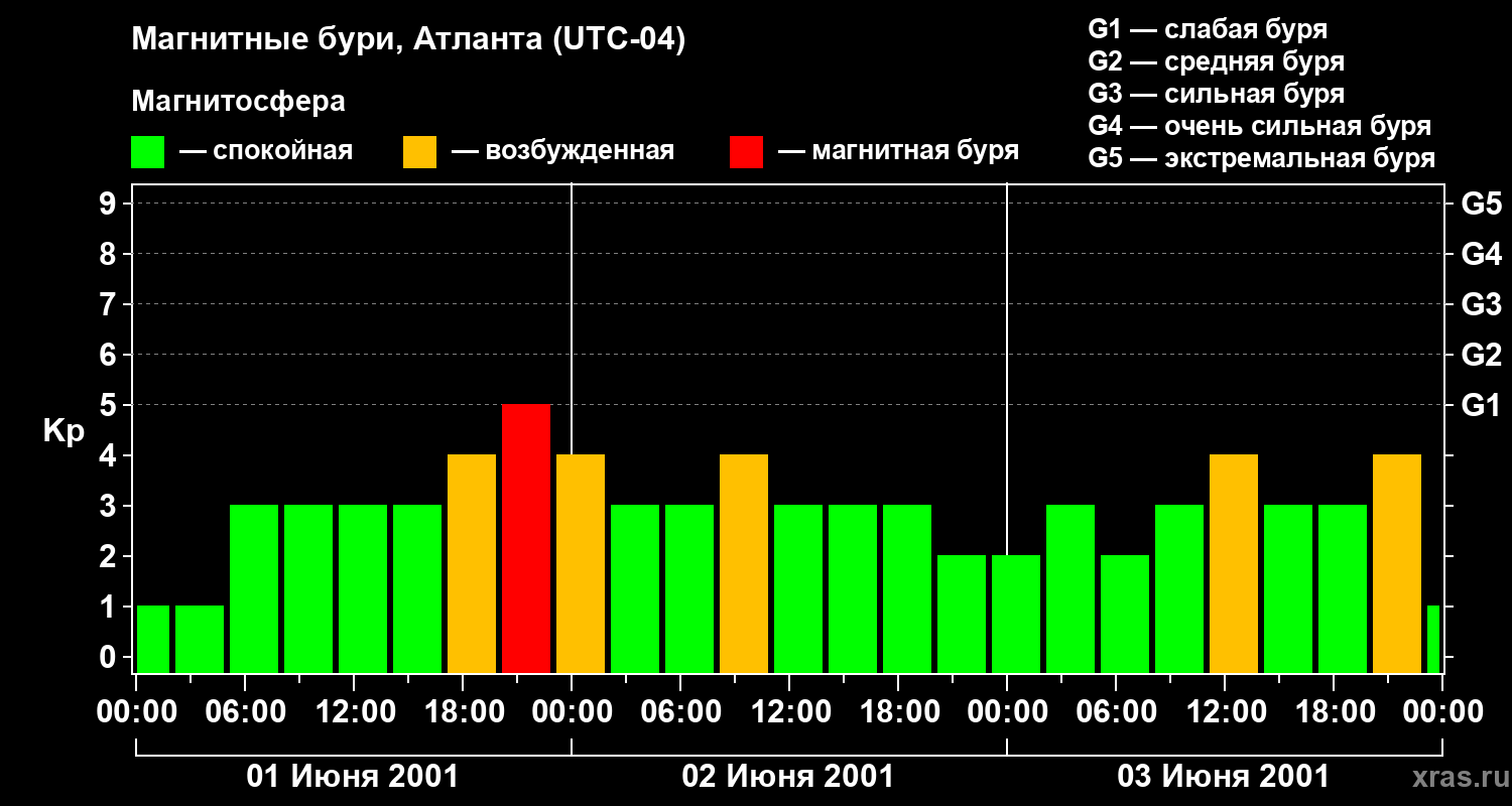 Изменения геомагнитного индекса Kp с 1 по 3 июня 2001 года для средних широт