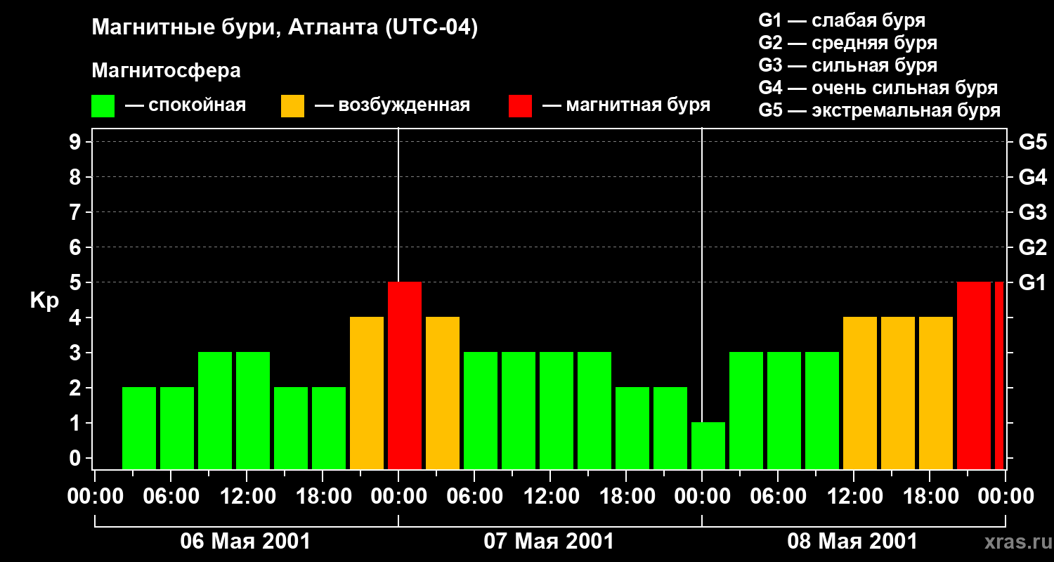 Изменения геомагнитного индекса Kp с 6 по 8 мая 2001 года для средних широт