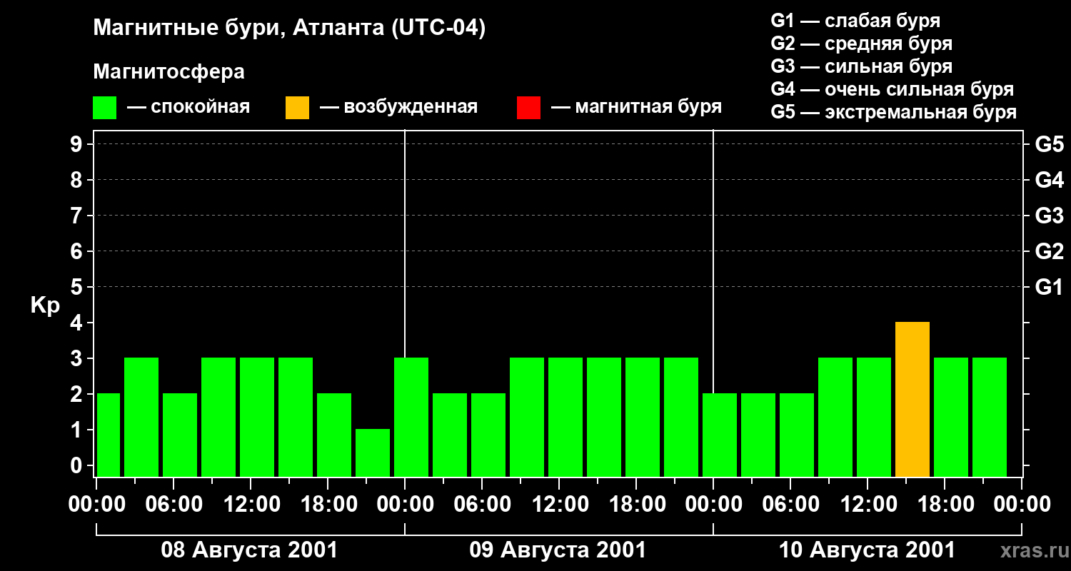 Изменения геомагнитного индекса Kp с 8 по 10 августа 2001 года для средних широт