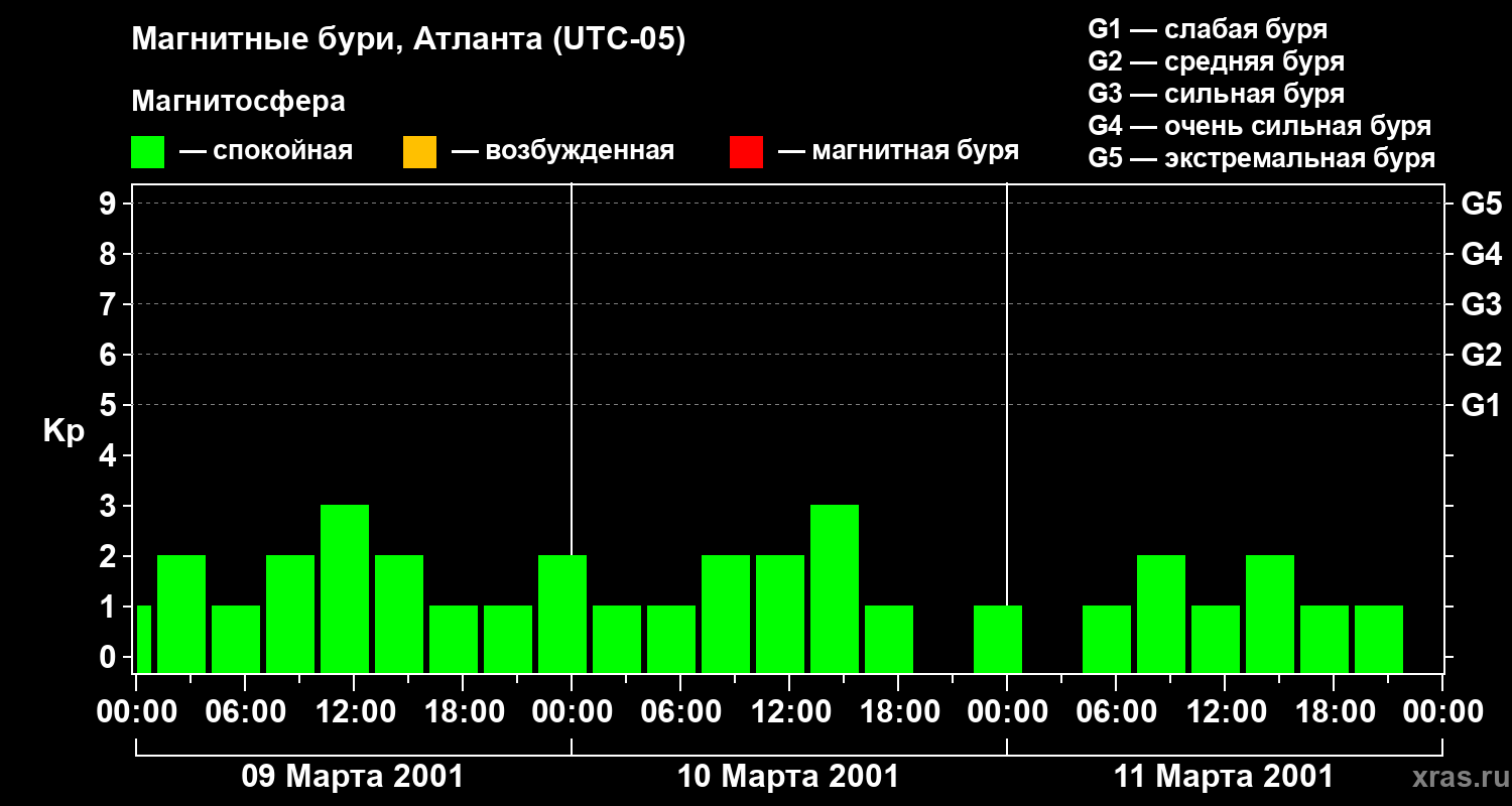 Изменения геомагнитного индекса Kp с 9 по 11 марта 2001 года для средних широт
