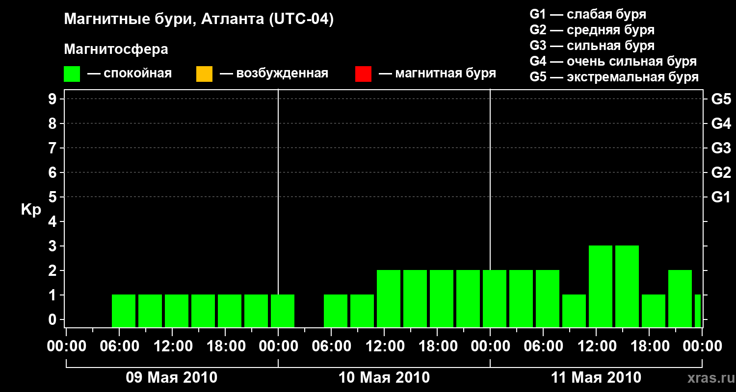 Изменения геомагнитного индекса Kp с 9 по 11 мая 2010 года для средних широт