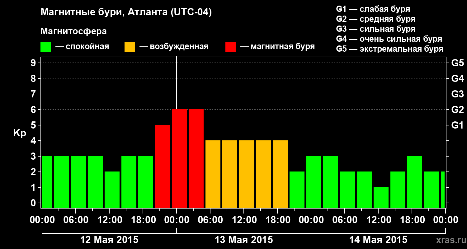 Изменения геомагнитного индекса Kp с 12 по 14 мая 2015 года для средних широт