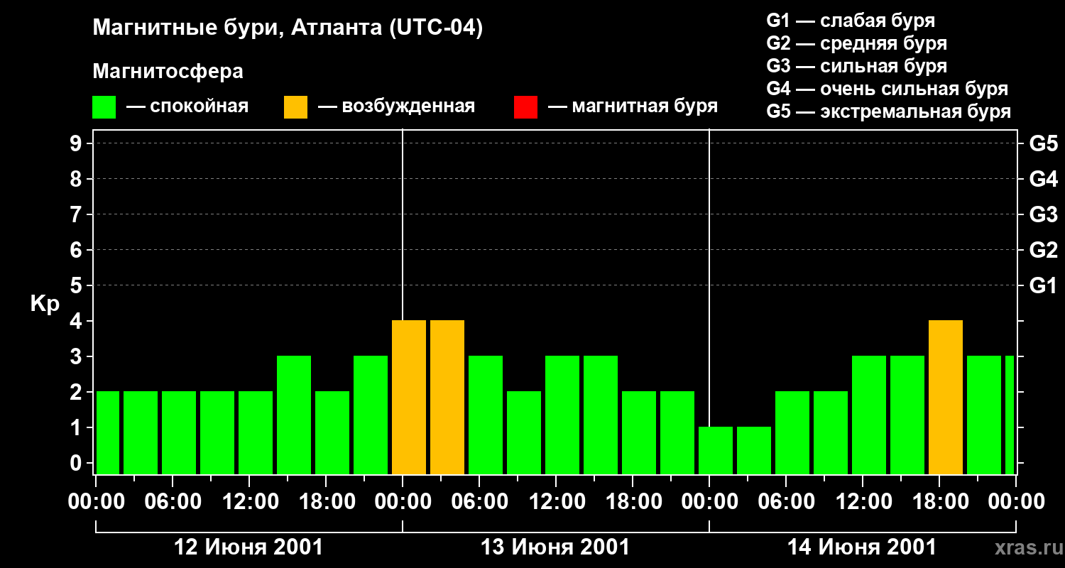 Изменения геомагнитного индекса Kp с 12 по 14 июня 2001 года для средних широт