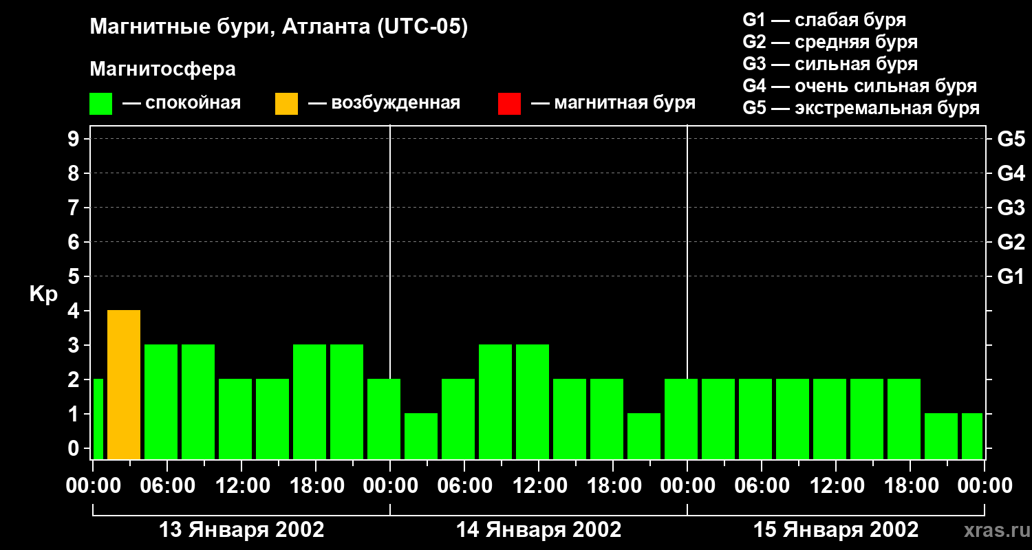 Изменения геомагнитного индекса Kp с 13 по 15 января 2002 года для средних широт