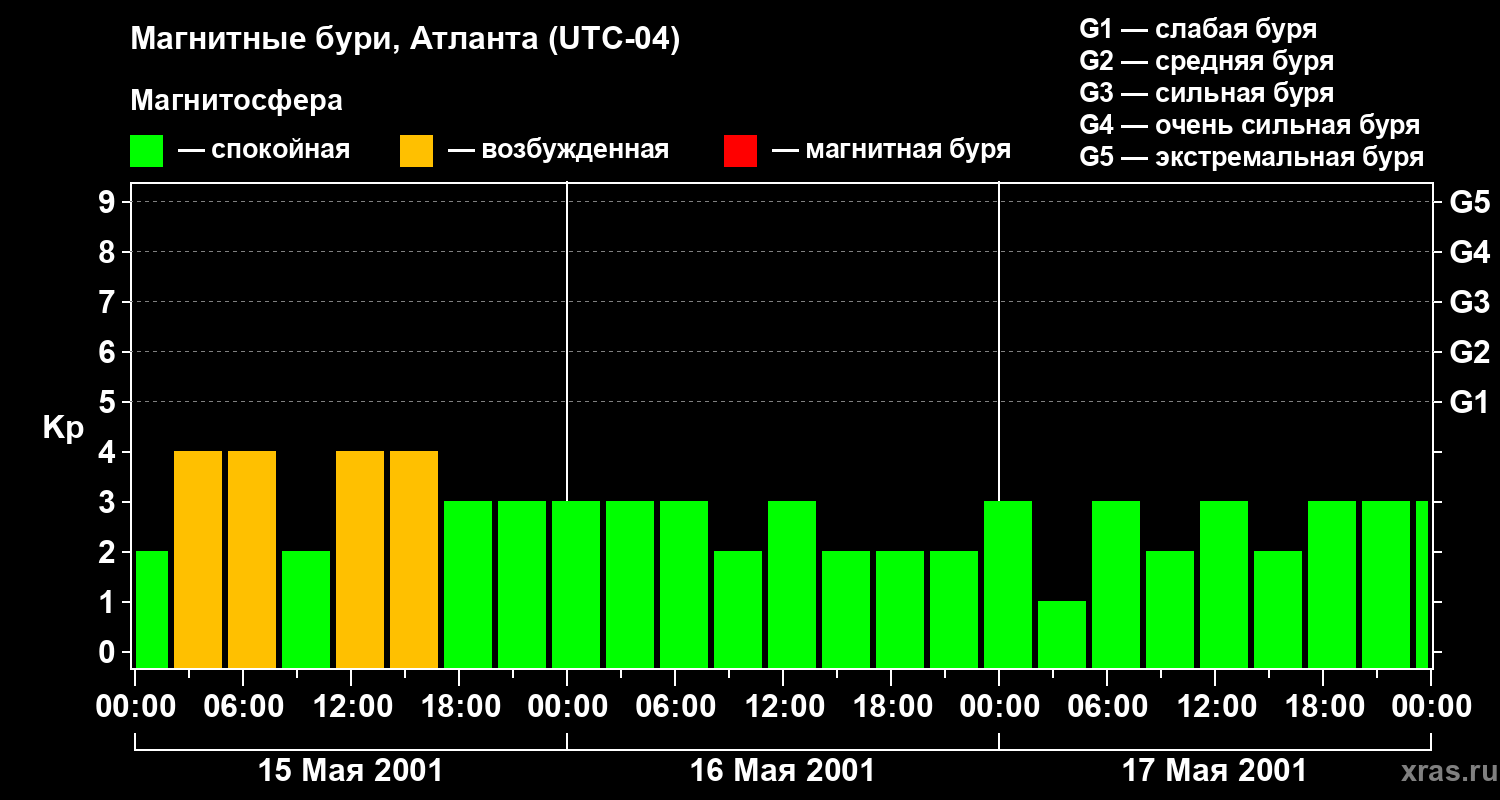 Изменения геомагнитного индекса Kp с 15 по 17 мая 2001 года для средних широт