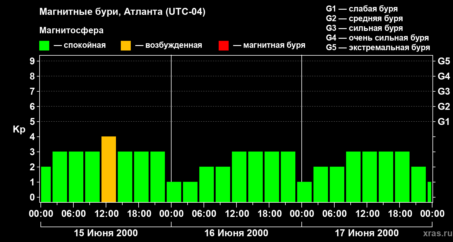 Изменения геомагнитного индекса Kp с 15 по 17 июня 2000 года для средних широт