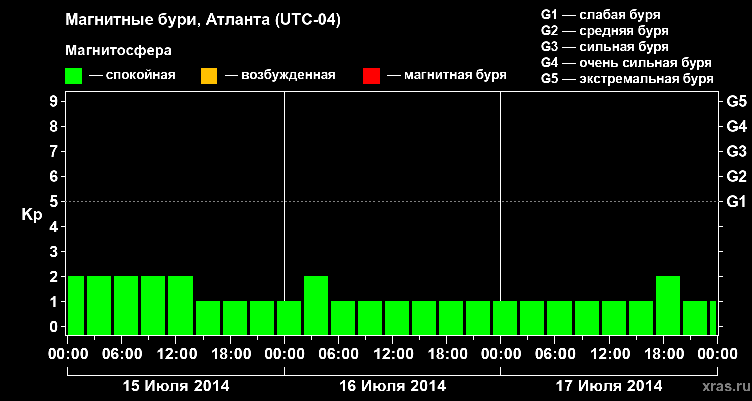 Изменения геомагнитного индекса Kp с 15 по 17 июля 2014 года для средних широт