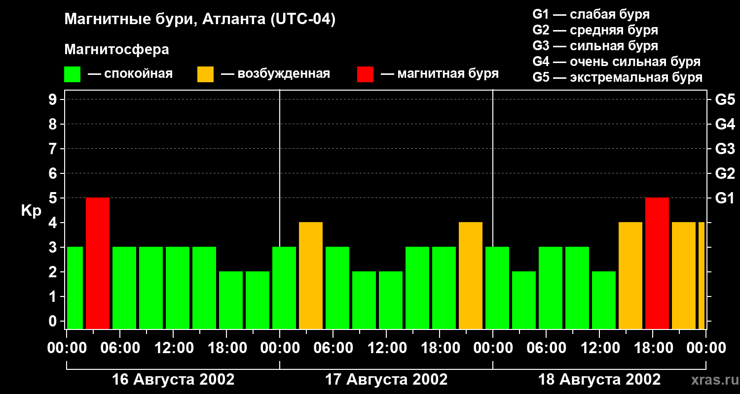 Изменения геомагнитного индекса Kp с 16 по 18 августа 2002 года для средних широт