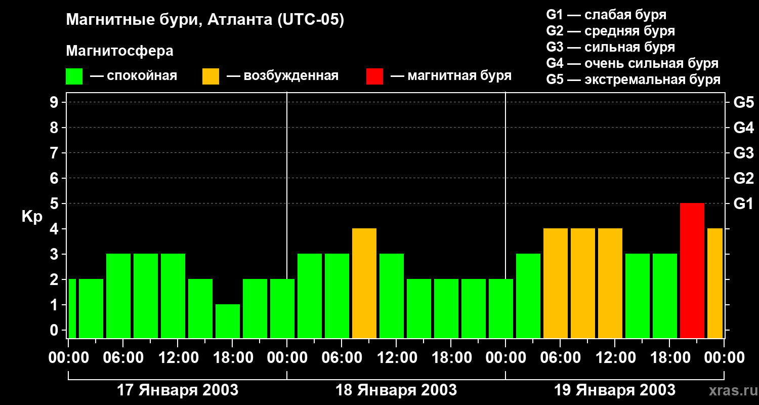 Изменения геомагнитного индекса Kp с 17 по 19 января 2003 года для средних широт