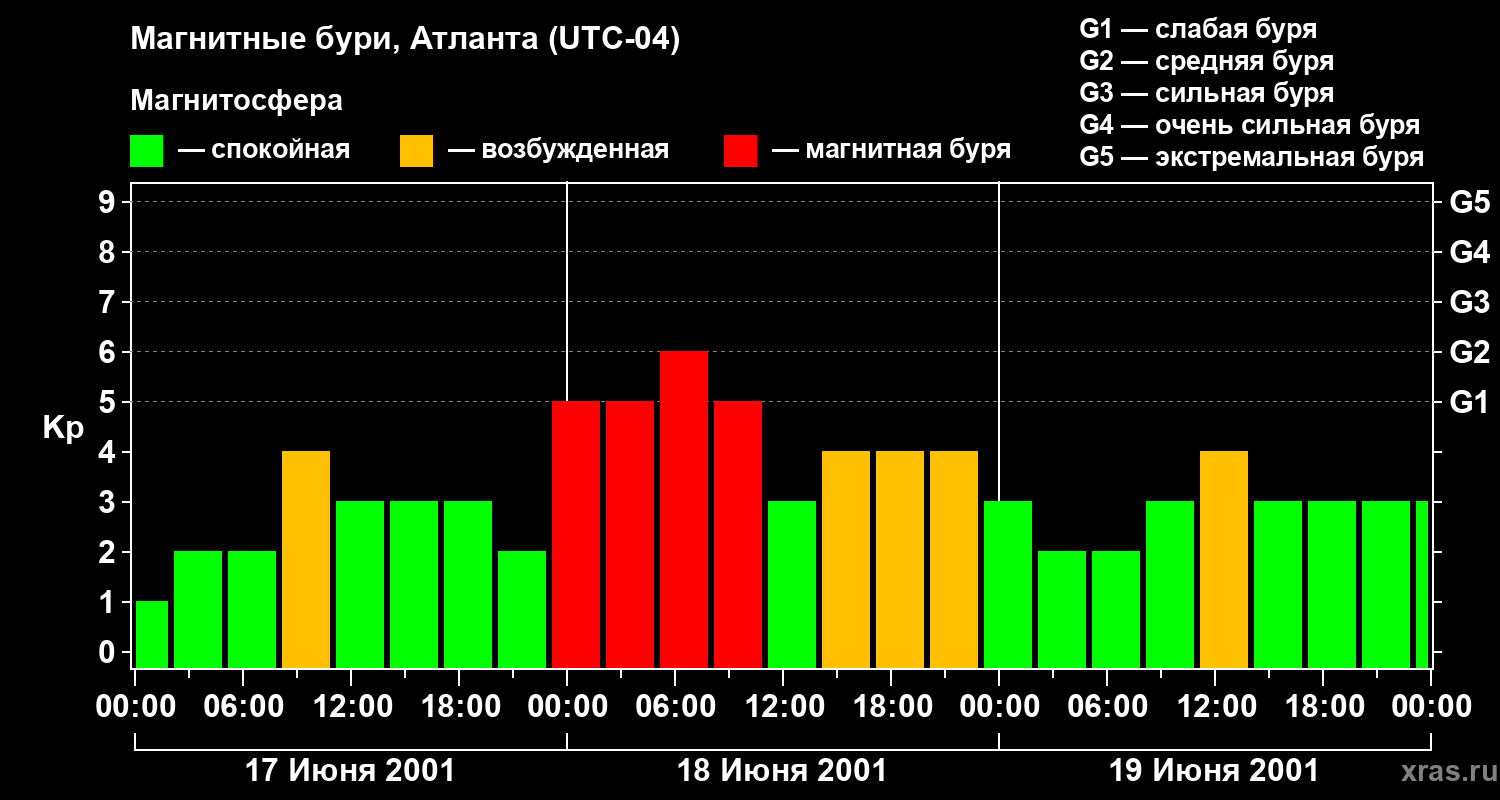 Изменения геомагнитного индекса Kp с 17 по 19 июня 2001 года для средних широт