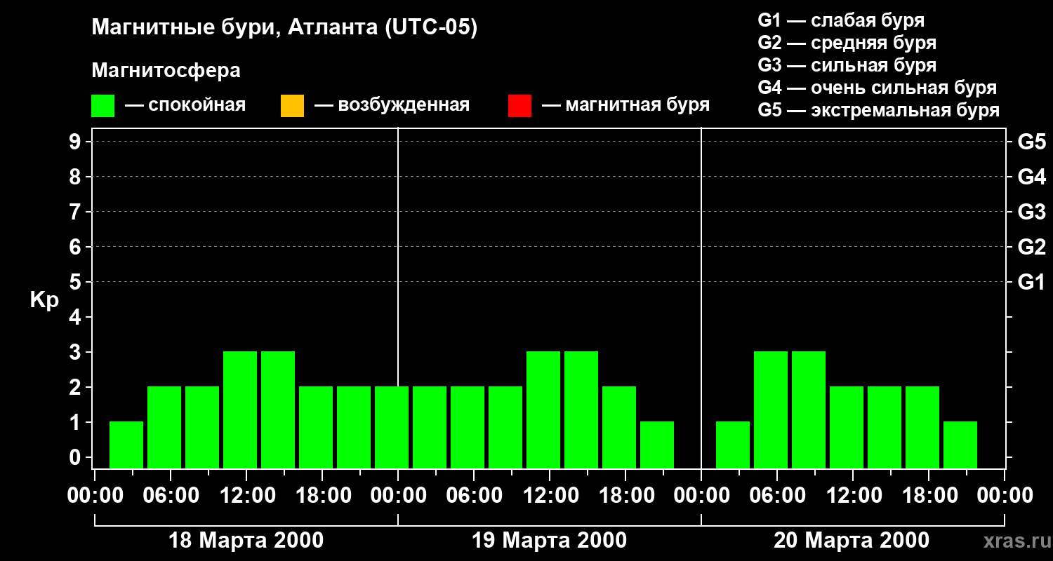 Изменения геомагнитного индекса Kp с 18 по 20 марта 2000 года для средних широт