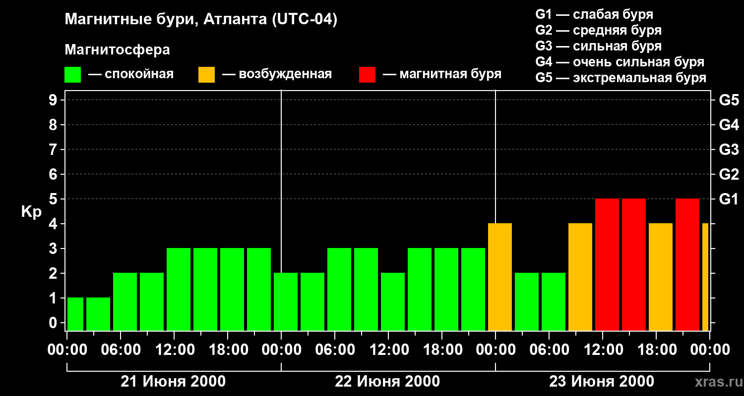 Изменения геомагнитного индекса Kp с 21 по 23 июня 2000 года для средних широт