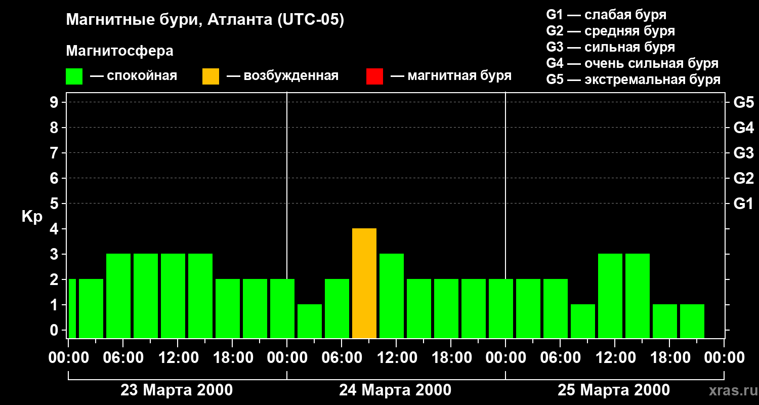 Изменения геомагнитного индекса Kp с 23 по 25 марта 2000 года для средних широт