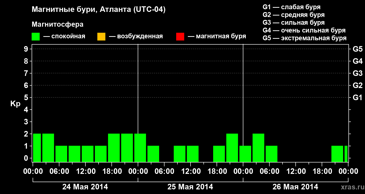 Изменения геомагнитного индекса Kp с 24 по 26 мая 2014 года для средних широт