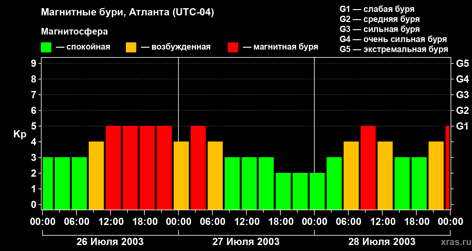 Изменения геомагнитного индекса Kp с 26 по 28 июля 2003 года для средних широт