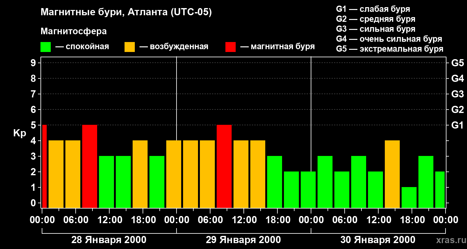 Изменения геомагнитного индекса Kp с 28 по 30 января 2000 года для средних широт