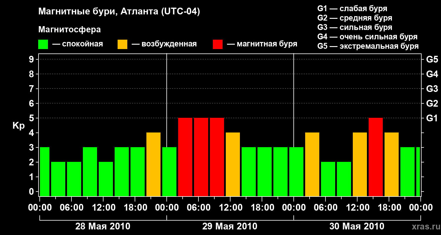 Изменения геомагнитного индекса Kp с 28 по 30 мая 2010 года для средних широт