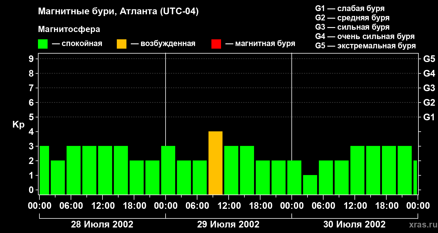 Изменения геомагнитного индекса Kp с 28 по 30 июля 2002 года для средних широт