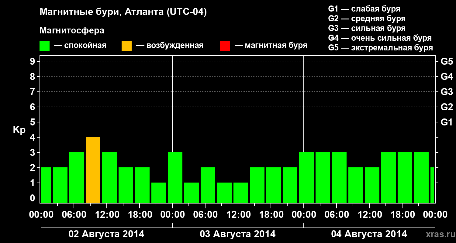 Изменения геомагнитного индекса Kp с 2 по 4 августа 2014 года для средних широт