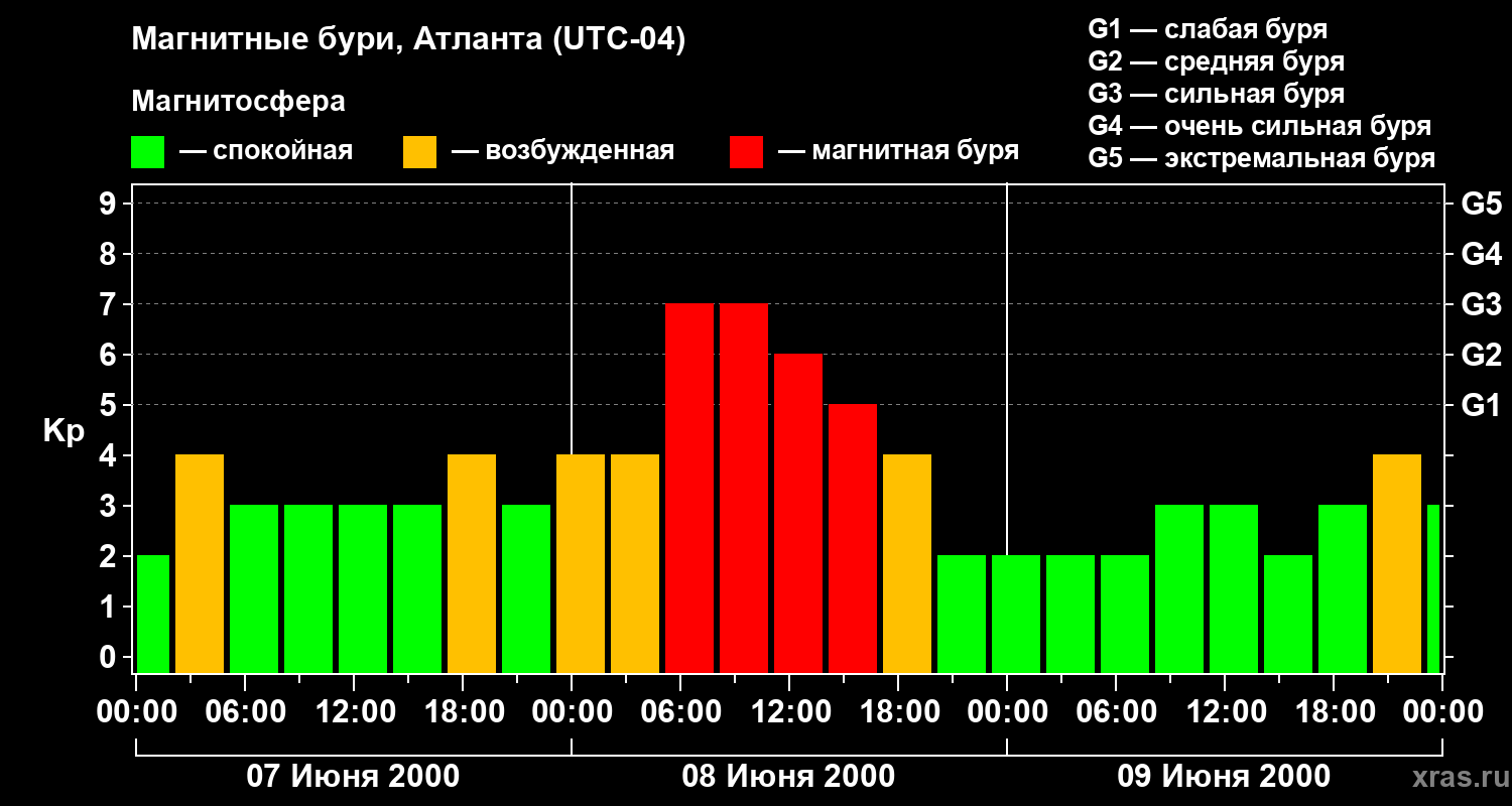 Изменения геомагнитного индекса Kp с 7 по 9 июня 2000 года для средних широт