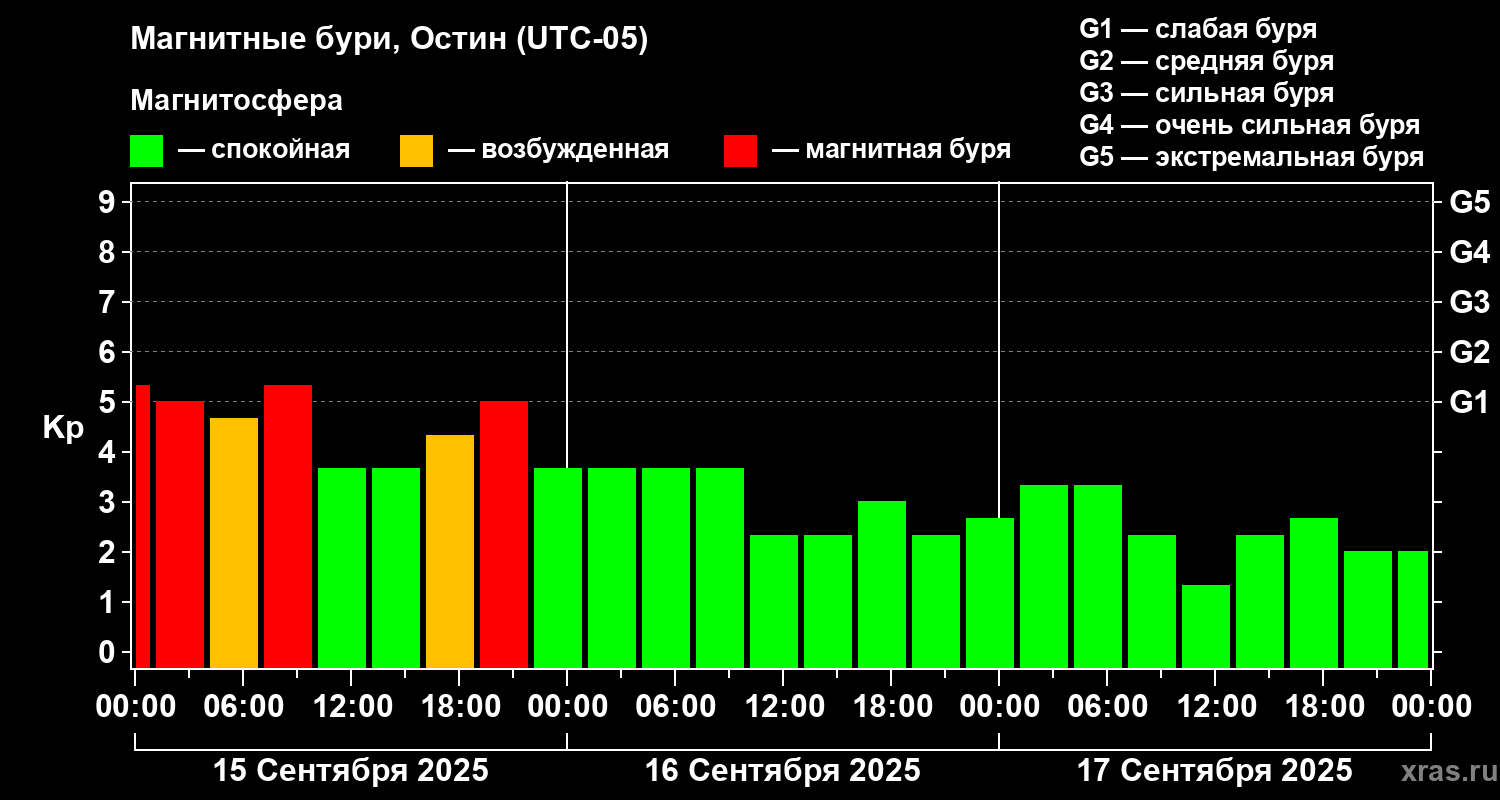 Изменения геомагнитного индекса Kp с 15 по 17 сентября 2025 года для средних широт